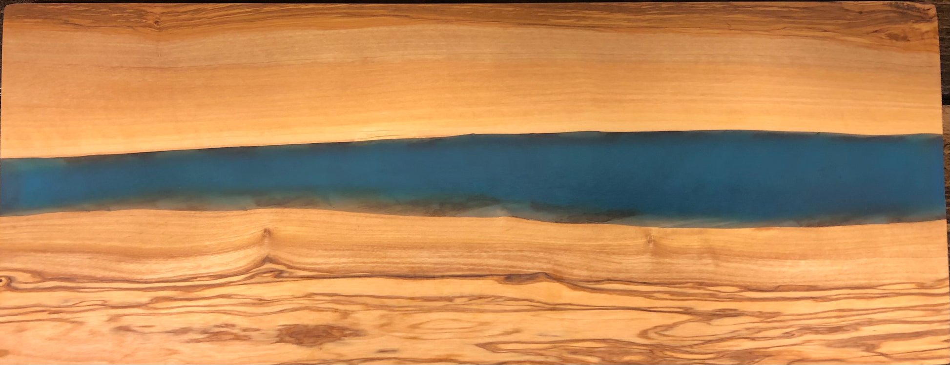 Beautiful Olive wood cutting board with accented in blue resin resembling a river running down the center.