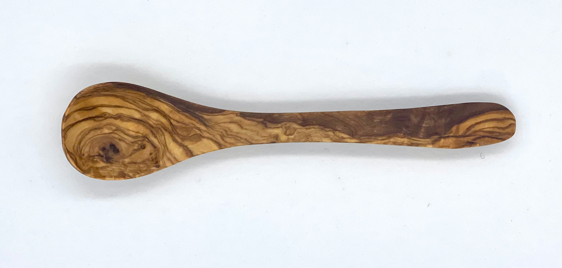 Small olive wood spoon. Perfect for sugar, salt and jam.