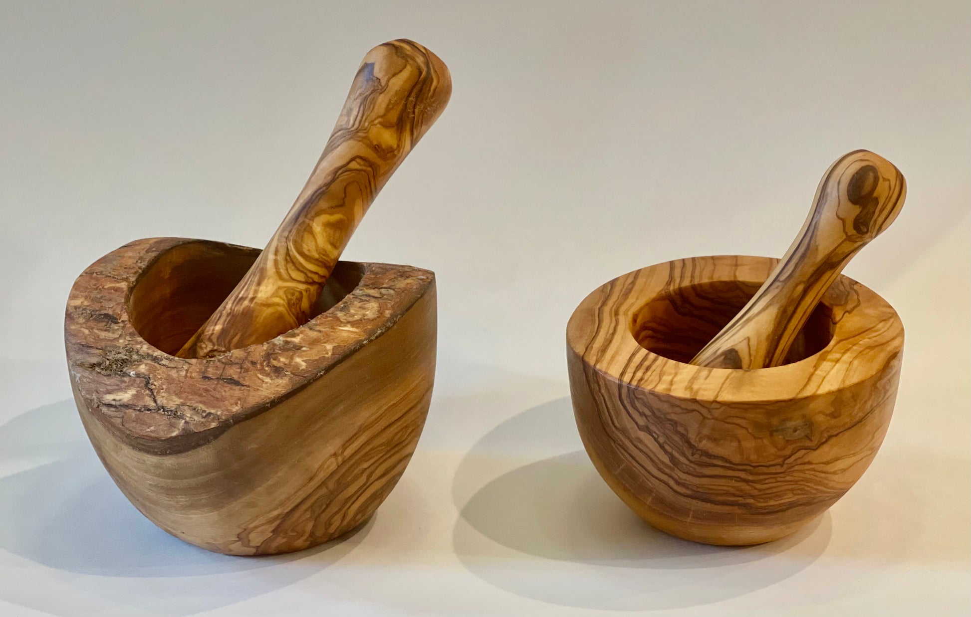 Our Mortar and Pestle will surely be a wonderful addition to your kitchen. Sturdy for the job and gorgeous grains and marbling of the olive wood making each of these pieces one of a kind. Give these as Gifts for someone else or just give them to yourself!